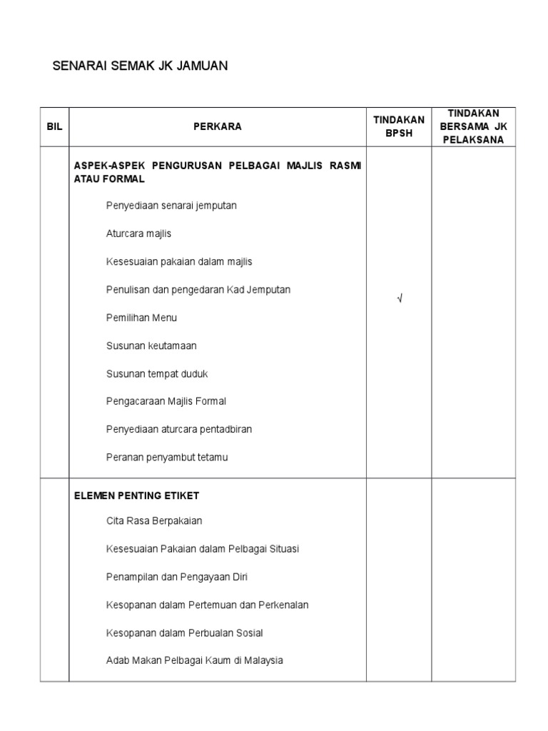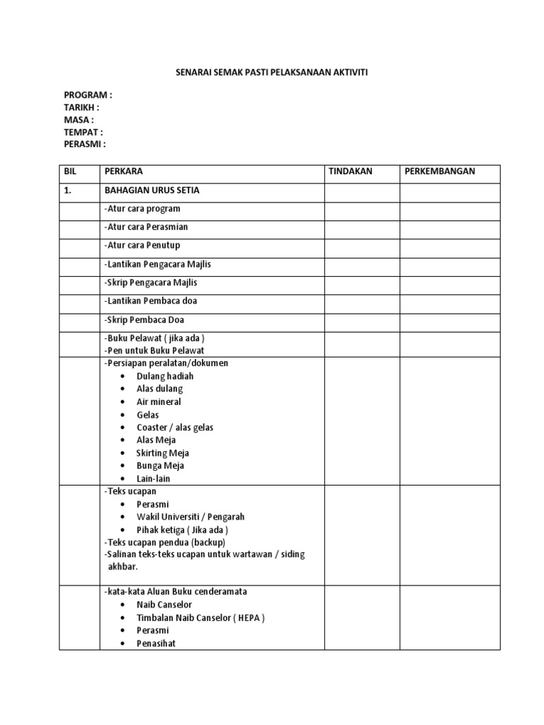 Atur cara majlisacara di dalam dewan dan di luar dewan. CONTOH SENARAI SEMAK TUGAS-TUGAS AJK KONVOKESYEN Status Tugas Bil. Tentukan susunan tempat duduk tetamu kehormat dan.