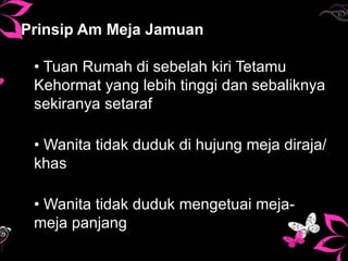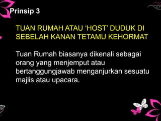 View 71 PENGURUSAN SUSUNAN TEMPAT DUDUK-20191205075128ppt from ECE MISC at The National University of Malaysia. 11 Suami Isteri Duduk Berjauhan. Terdapat juga Prinsip Am yang berkaitan meja jamuan iaitu Tuan Rumah di sebelah kiri Tetamu Kehormat yang lebih tinggi dan sebaliknya sekiranya setaraf Wanita tidak duduk di hujung meja diRajakhas Wanita tidak duduk mengetuai meja-meja panjang Meja bulat hendaklah penuh kecuali dihadiri oleh SPBYDARaja-raja dua kerusi di hadapannya hendaklah dikosongkan dan.