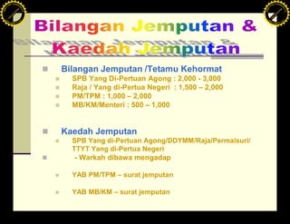 Jumlah Dif dipentas Jemputan seorang- 57 Jemputan berpasangan 46 Penghormatan kepada individu tertentu Host dan tetamu kehormat Penganjur tuan rumah di kanan tetamu kehormat Kedudukan berpasangan Isteri sentiasa di. Sunday September 25 2011. Rujukan kehormat bermula dengan Yang.