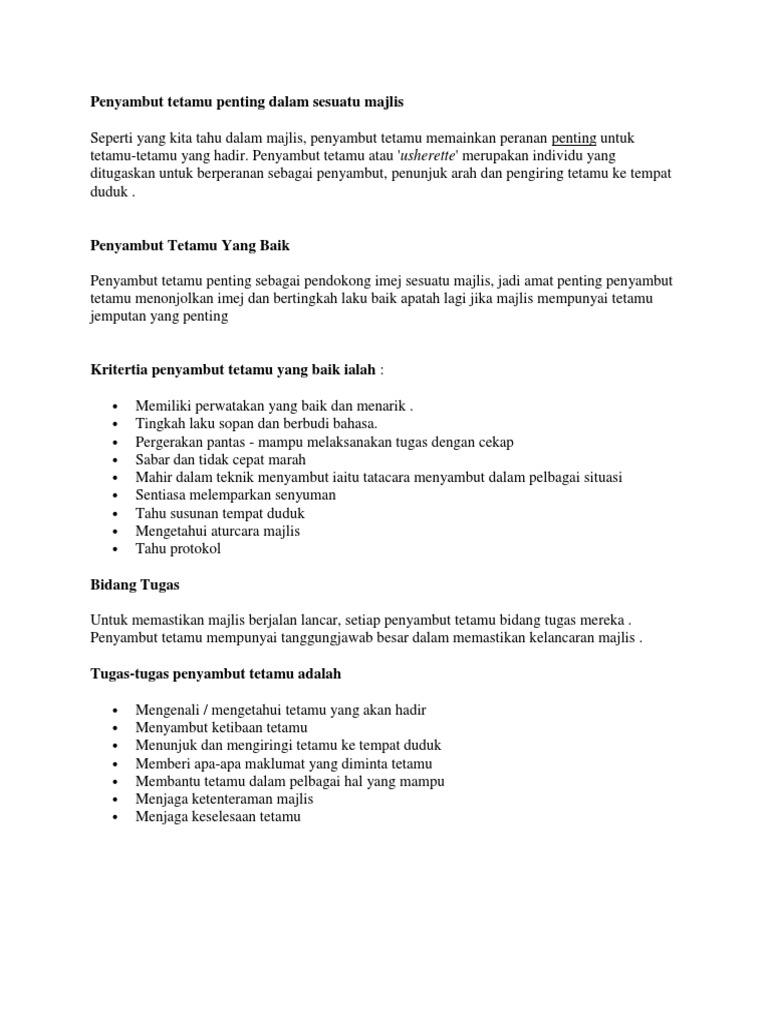 Peranan penyambut tetamu. Penyambut tetamu usherette adalah orang yang memainkan peranan yang paling penting dalam menyambut tetamu dan memastikan supaya tetamu dalam sesuatu majlis itu dapat 10 diuruskan dengan baik dan lancar tanpa menimbulkan rasa tidak puas hati rasa tersinggung dan rasa tidak selesa daripada tetamu yang dijemput. TANGGUNGJAWAB DAN PERANAN PENYAMBUT TETAMU DALAM PELBAGAI MAJLIS FORMAL DAN TIDAK FORMAL Kategori Penyambut Tiga kategori. Pemakaian Anugerah Darjah Kebesaran jika.