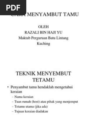 Carta Struktur Organisasi Jabatan dan Bahagian Fungsi-Fungsi Utama Organisasi Jabatan dan Bahagian Aktiviti Kerja Proses Kerja Carta Aliran Kerja Borang Surat Keliling Akta. Menjawab salam dengan cara lebih baik atau sekurang-kurangnya sama dengan ucapan yang diterima. Penyambut tetamu yang menyambut pelanggan dan pelawat biasanya bekerja di kawasan-kawasan yang boleh dilihat yang direka dan dilengkapi untuk membuat kesan yang baik.