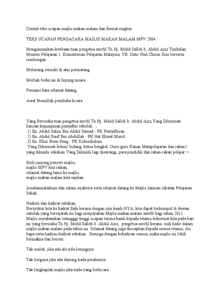 Contoh Ucapan Pengacara Majlis MC bagi Majlis Makan Malam. Mohd Mahdi bin Musa serta tetamu-tetamu sekalian ke Majlis Malam Seribu Kenangan bersama Yang Berbahagia Tuan Haji Che Razali bin Adis. 25 Mac 2018 Ahad Masa.
