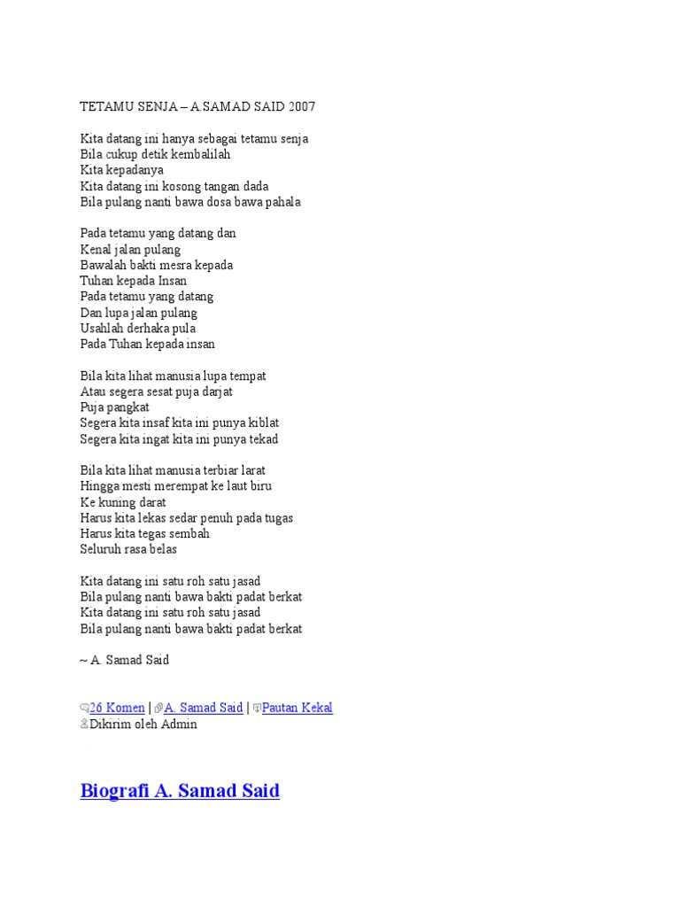 Kita ini tetamu senja. Semoga sajak kemerdekaan yang pernah dihasilkan oleh tokoh sasterawan negara dan tokoh sastera kita ini dapat menjadi inspirasi buat kita semua rakyat datuk a samad said atau nama sebenarnya abdul samad bin muhammad said merupakan seorang yang tidak asing lagi bagi rakyat malaysia. Bawalah bakti mesra kepada Tuhan kepada Insan.