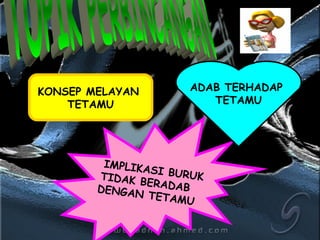 Adab terhadap tetamu Edisi hari raya - NO 4 RAMAI TAK IKUThai Assalamualaikum semua. Adab Menyambut Tetamu di dalam Islam NURUL NAJWA BINTI MOHAMAMD ALI 09DEV19F1019 SITI NURSHAFIQAH BINTI MOHD SHAROM 09DEV19F1028 NURUL BASIRAH BINTI MUHAMAD NAJI 09DEV19F1007 Konsep KONSEP MELAYAN TETAMU DEFINISI PERTAMA DEFINISI KEDUA DIDI FRIENDS Tetamu wajib dilayan. Tetamu juga hendaklah meniatkan pahala daripada mendatangi undangan tersebut kepada tuan rumah.